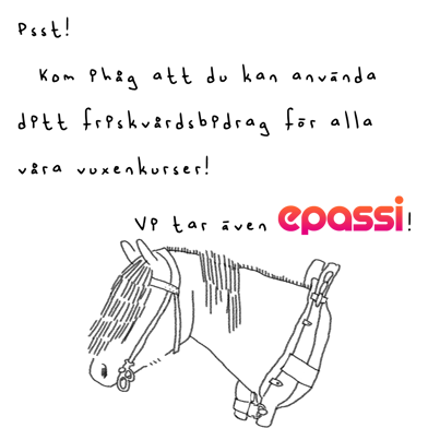 Övriga kostnader: Ridbanehyra 50 kr per tillfälle betalas till Hästens Skafferi AB på plats.